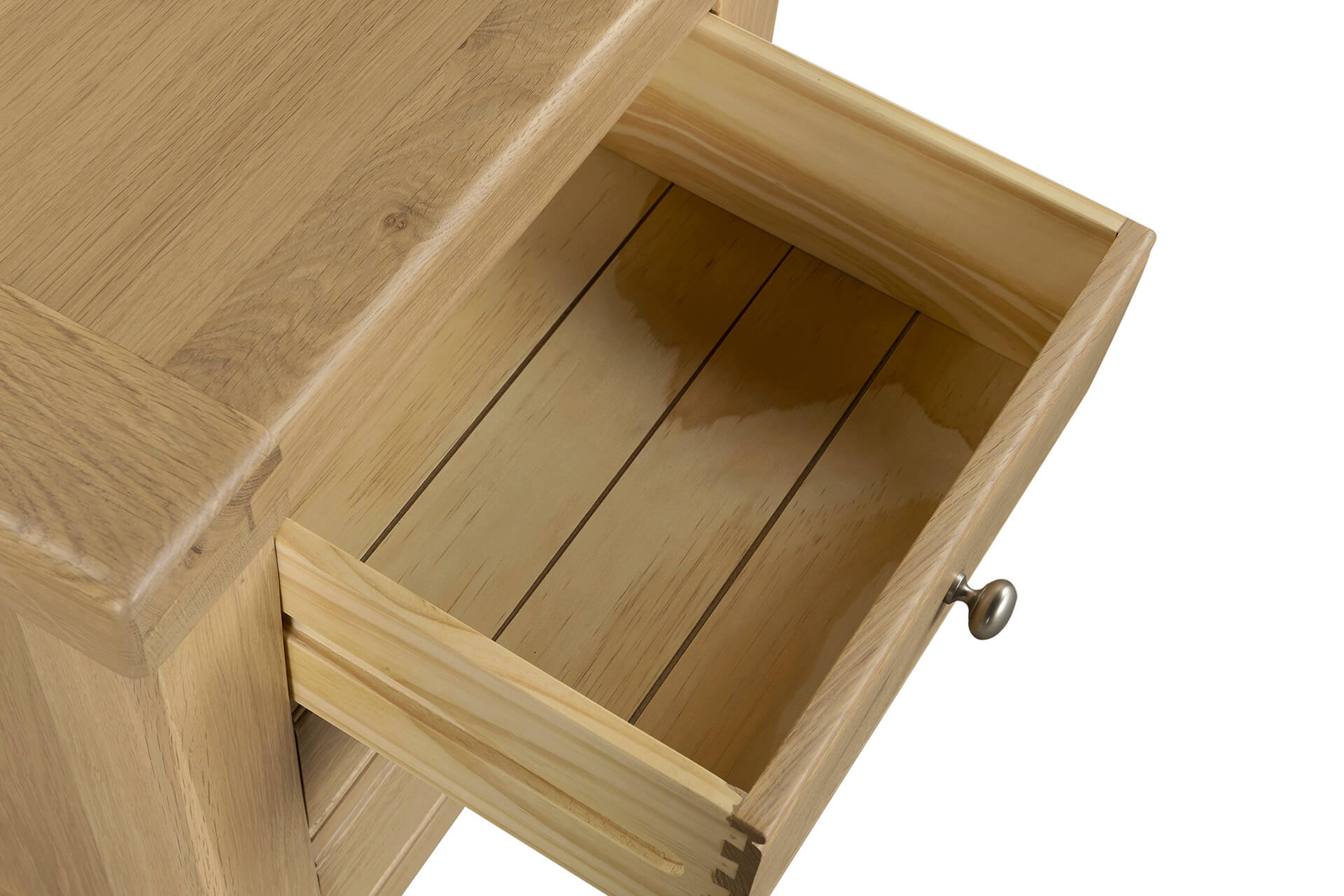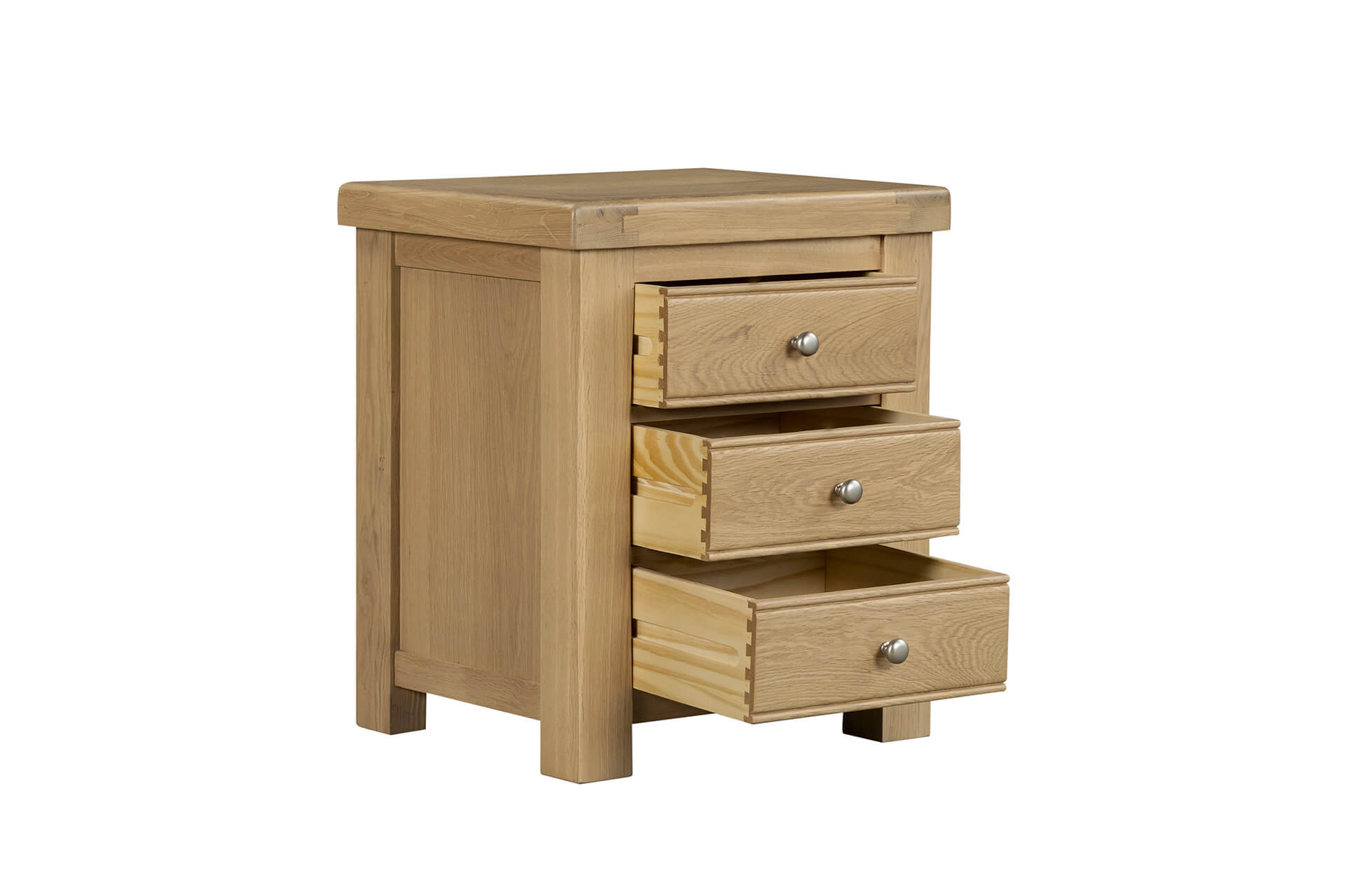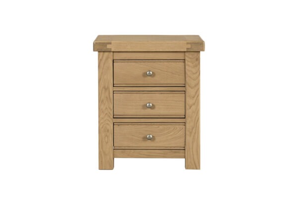 The Newhaven Oak 3 drawer locker is made from beautiful oak and veneer. This collection is treated with an oil and lustre finish which brings out a contrast in the beautiful oak grain. A groove panelled element is carried through all pieces and chests. It is elegantly finished with silver handles and drawers feature dovetail joints.